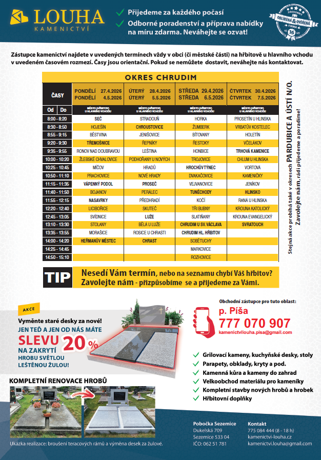 Rozvoz se uskuteční ve středu 29. dubna 2026 v 8:35 na parkovišti u školy. Objednávky na telefonech 602 715 811 a 730 897 979.