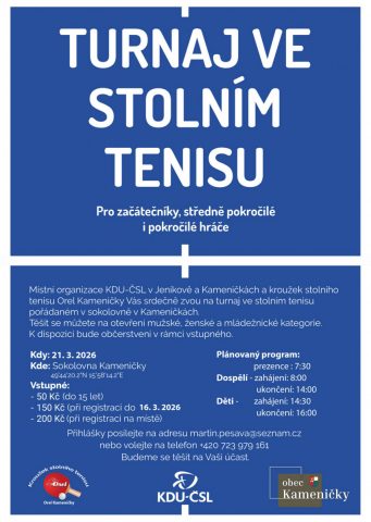 Místní organizace KDU-ČSL Jeníkov a Kameničky a Orel Kameničky Vás srdečně zvou na 11. ročník turnaje ve stolním tenisu.