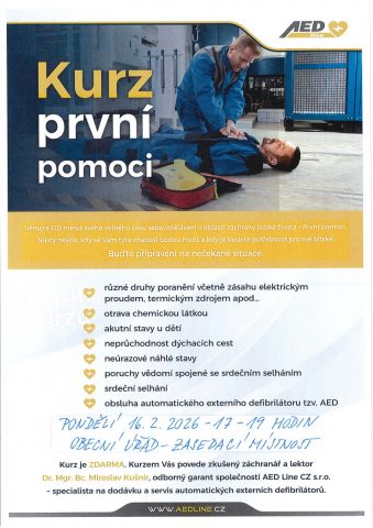 V pondělí 16.2.2026 od 17 do 19 hodin se koná v zasedací místnosti obecního úřadu Kurzu první pomoci pro občany obce Svratouch. Kurz je zdarma. V případě zájmu, prosíme o potvrzení účasti na email: ou@svratouch.cz nebo volejte na obecní úřad.