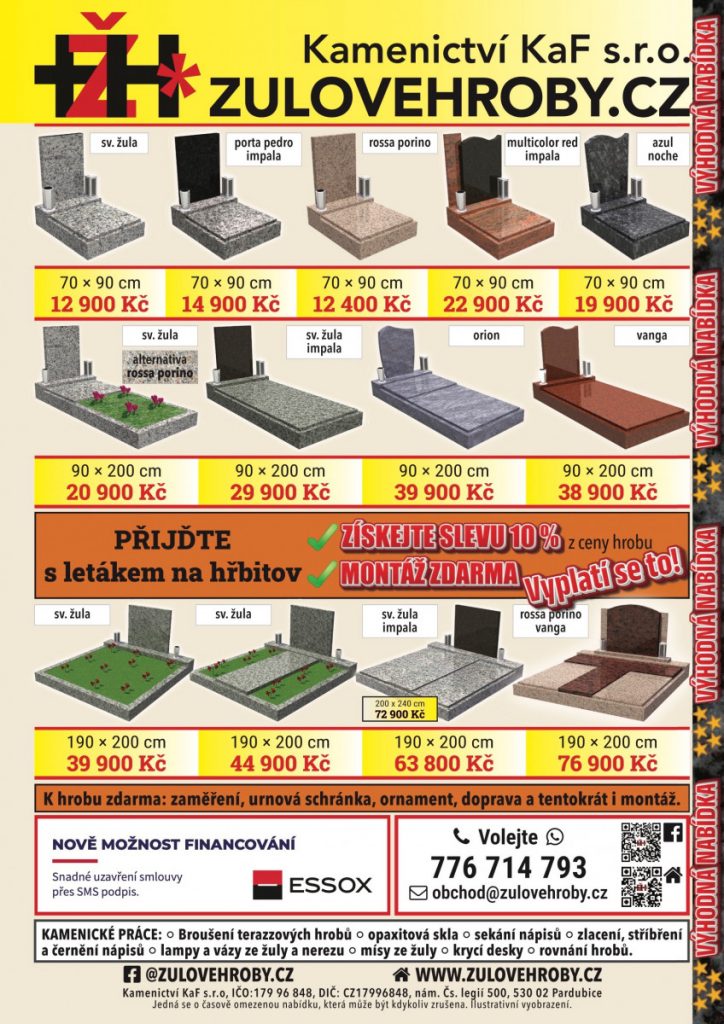 V pondělí 27. 10. a 3. 11. v 12:30 – 12:50 bude na hřbitově ve Svratouchu obchodní zástupce Kamenictví KaF s.r.o. a Žulovéhroby.cz  přijímat objednávky k opravám hrobů. Poskytujeme veškeré kamenické práce. Přijďte na hřbitov a využijte naši výhodnou nabídku.