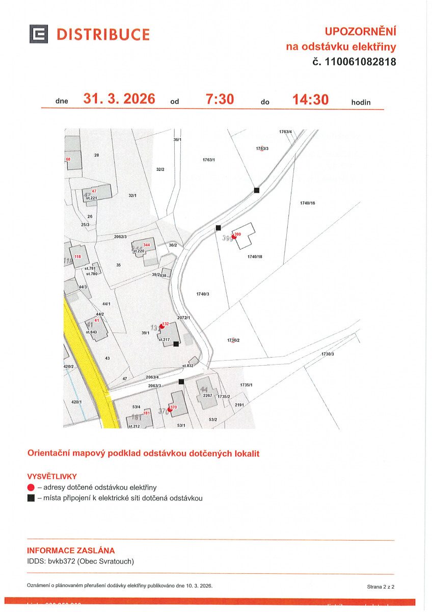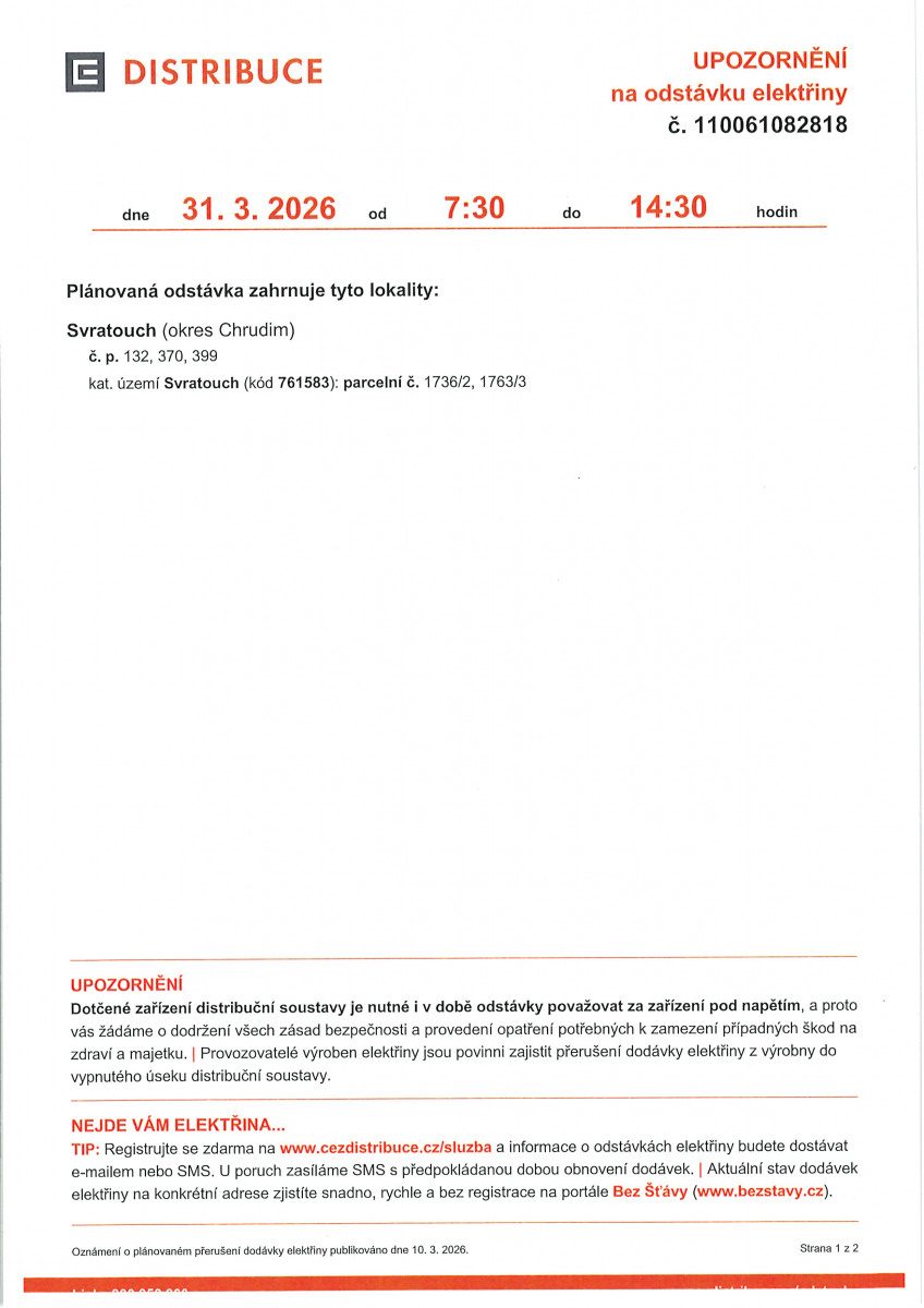 Upozornění na odstávku elektřiny